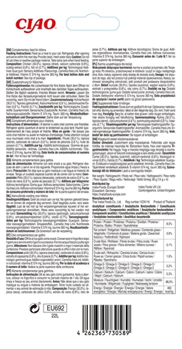 Samenstelling: Water, kip, tapiocazetmeel, natuurlijke smaakstoffen, guargom, calciumcarbonaat, natuurlijke tonijnaroma, visolie, vitamine E-supplement, taurine, groene thee-extract