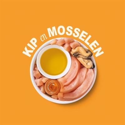 Vers bereide kip (45%), vers bereide mosselen 3%, kippenbouillon 47%, zonnebloemolie, mineralen, tapioca, tonijnolie.