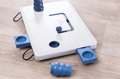 Verstop wat lekkers onder de kegels en in de laatjes. Jouw hond moet de kegels uit de gaten trekken, laatjes openen door aan touwtjes te trekken of de hendel verschuiven.