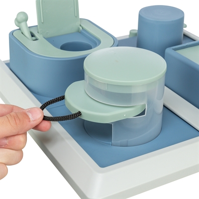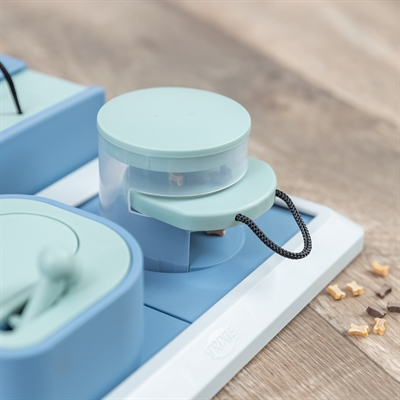 Verberg snacks of brokjes op vijf verschillende manieren bij dit leuke spel voor je hond. Je hond ruikt de snacks of brokjes en zal verschillende technieken moeten toepassen om bij de brokjes of snacks te komen.