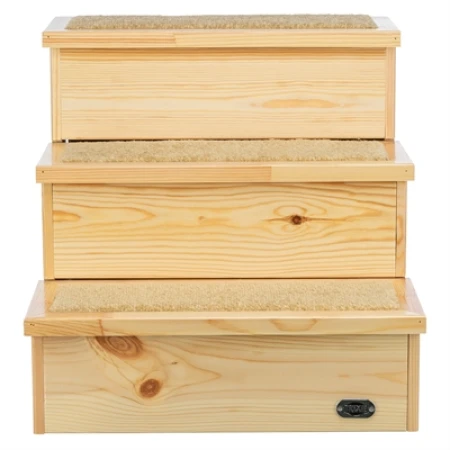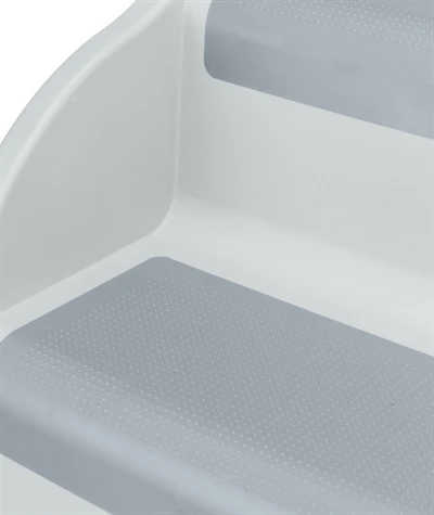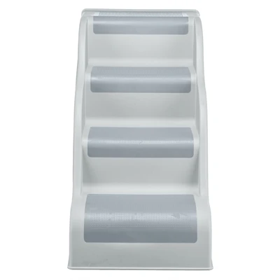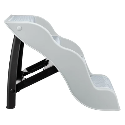 De Trixie Trap Lichtgrijs is een inklapbare kunststof trap met slipvaste voetjes, om de hond binnen en buiten de auto, bank of het bed op te helpen. Is jouw hond slecht ter been of te klein om bepaalde plekken te bereiken waar hij of zij graag komt? Help jouw hond dan met deze handige trap van Trixie! Deze trap is speciaal gemaakt om kleine, oudere of honden met lichamelijke klachten te helpen hoger gelegen plekken te bereiken. De trap is gemaakt van kunststof en makkelijk afneembaar, waardoor je hem binnen voor het bed of de bank kunt gebruiken, maar buiten ook voor hoger of lager gelegen delen van de tuin of zelfs de auto. De standaard van de trap is inklapbaar zodat hij ruimtebesparend is op te bergen en de treden zijn bekleed met antislip TPR-lookvlakken. Ook is de trap voorzien van rubberen antislip voetjes zodat hij niet verschuift tijdens het gebruik en jouw dier zo veilig en zelfverzekerd de trap op kan.