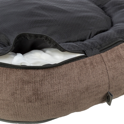 De Trixie Vital Hondenmand Lennox Rond Bruin is een orthopedische mand die speciaal ontworpen is voor maximaal ligcomfort. Dankzij de combinatie van visco-elastische schuimvlokken (met memory-effect) en een stabiele randvulling van schuimrubber en polyestervezel krijgt je hond optimale ondersteuning tijdens het rusten. De hoes van meubelstof (Chenille) voelt zacht aan, is afneembaar en wasbaar (op 40 °C), terwijl de slipvaste onderkant ervoor zorgt dat de mand goed op zijn plek blijft liggen. Ideaal voor honden die houden van een knusse, comfortabele slaapplek.