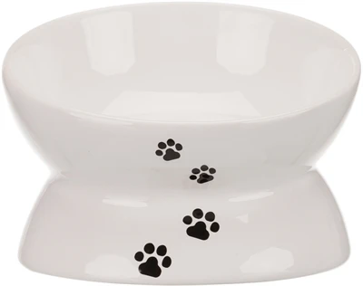 De Trixie Voerbak Kat Wit 150 ml 13 cm is een ergonomische, keramische voerbak of waterbak voor de kat. Deze bak staat verhoog, op een soort voetstuk, waardoor de kat minder ver door de poten hoeft te zakken om te eten. Dit komt de gewrichten en spijsvertering ten goede. De bak is gemaakt van keramiek en daardoor niet alleen makkelijk af te nemen, maar ook te gebruiken voor water of natvoer. De voerbak is wit met een leuke opdruk van zwarte pootafdrukjes.