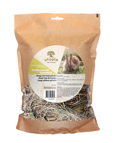 Het Utopia Timothy Hooi Met Berkenblad 450 gr is een aanvullende diervoeding voor konijnen en knaagdieren met een hoog ruwvezelgehalte. Timothy Hooi is een gezonde en lekkere hooisoort voor konijnen en knaagdieren. Dit hooi heeft een hoog ruwvezelgehalte en is goed voor de tanden en spijsvertering. Daarnaast heeft het een gunstige calcium/fosfor verhouding. Timothy Hooi is een zeer smakelijk hooi wat goed gegeten wordt. Het toegevoegde berkenblad bevat veel ruwe vezels en vitamine C. Daarnaast heeft het een positieve uitwerking op de nierfunctie. Dit hooi is 100% natuurlijk, zonder suiker, smaakversterkers, additieven, kleurstoffen en conserveringsmiddelen.